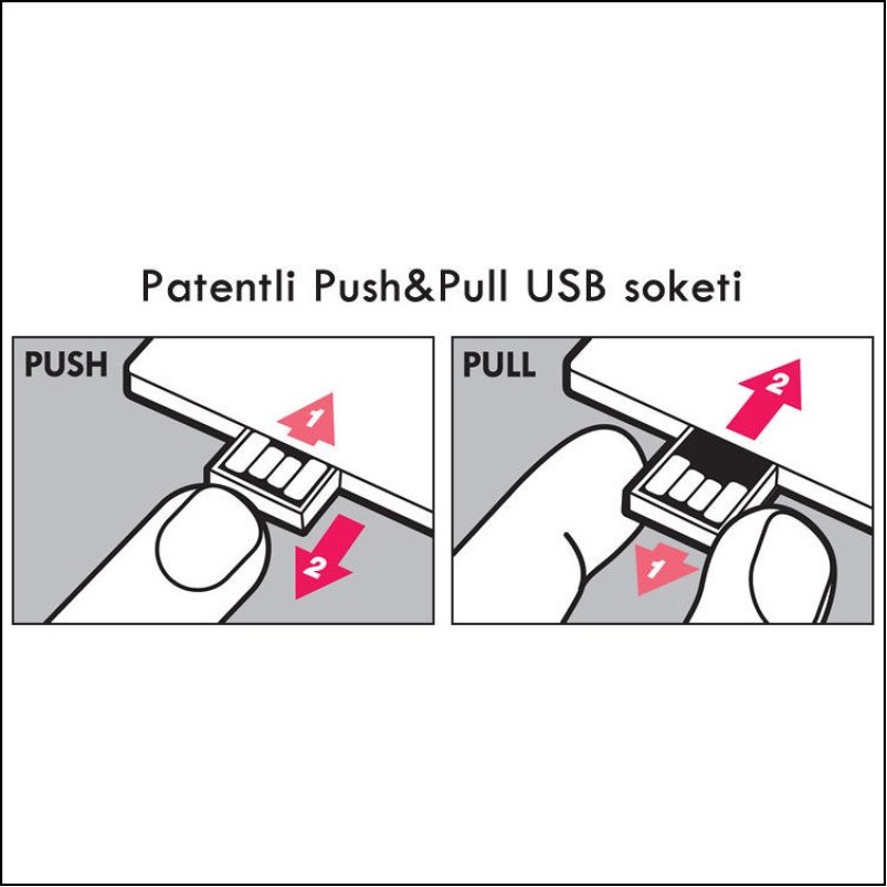Push&Pull Usb soketi ürüne eşsiz bir özellik katmaktadır. Bastırıldığı zaman içine giren usb soketi ürün kullanılmadığı zaman hem dış etkenlerden korunuyor hem de logonuzun şeklini tamamlamış oluyor.